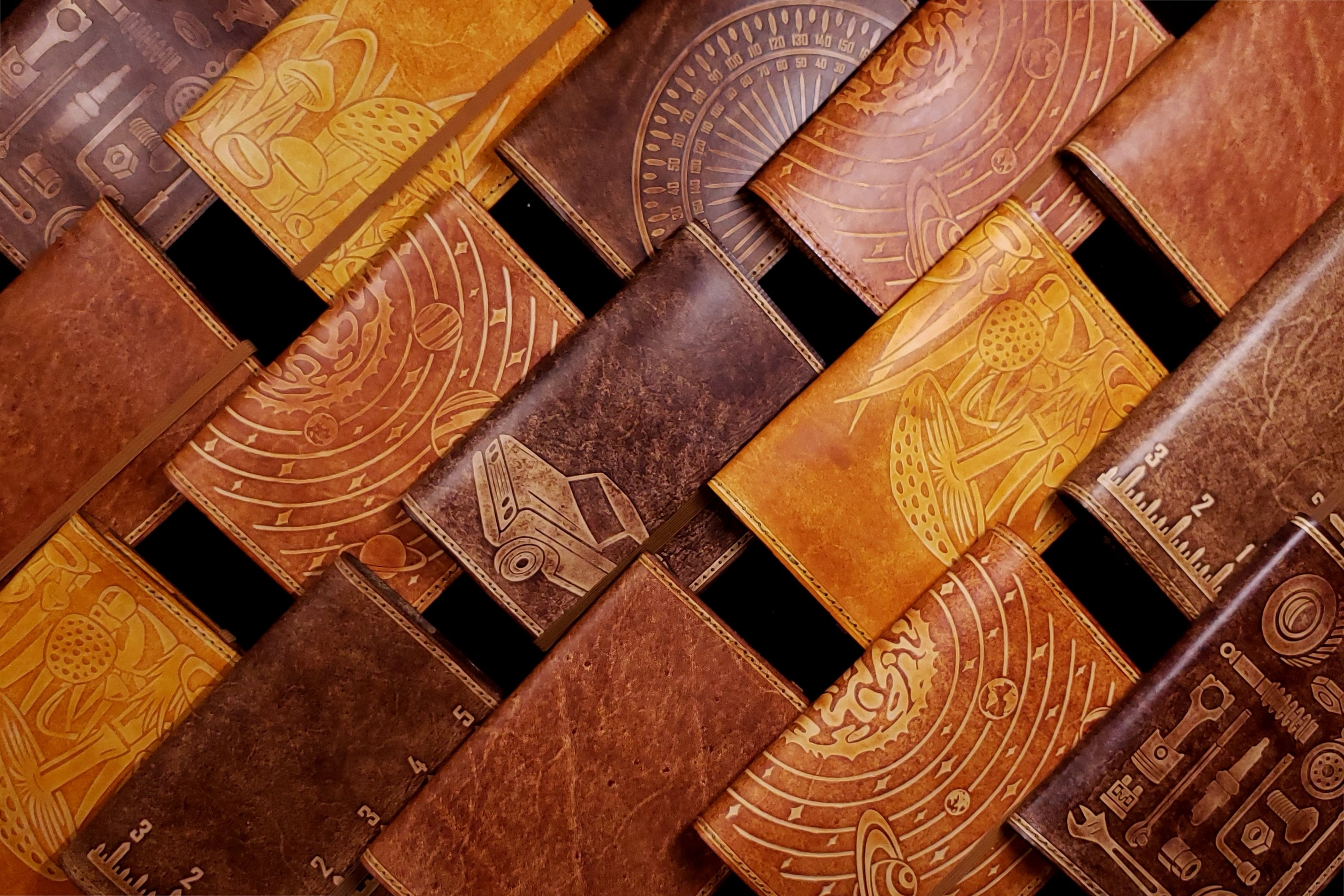 These covers are designed to fit a standard 5"x3.5" journal. For now, they come in 5 different designs: Plain, Space, Ruler, Mushroom, and Mechanic. Check back to see new designs,and if you have a specific design in mind then contact us and we'll be happy to customize it for you :)